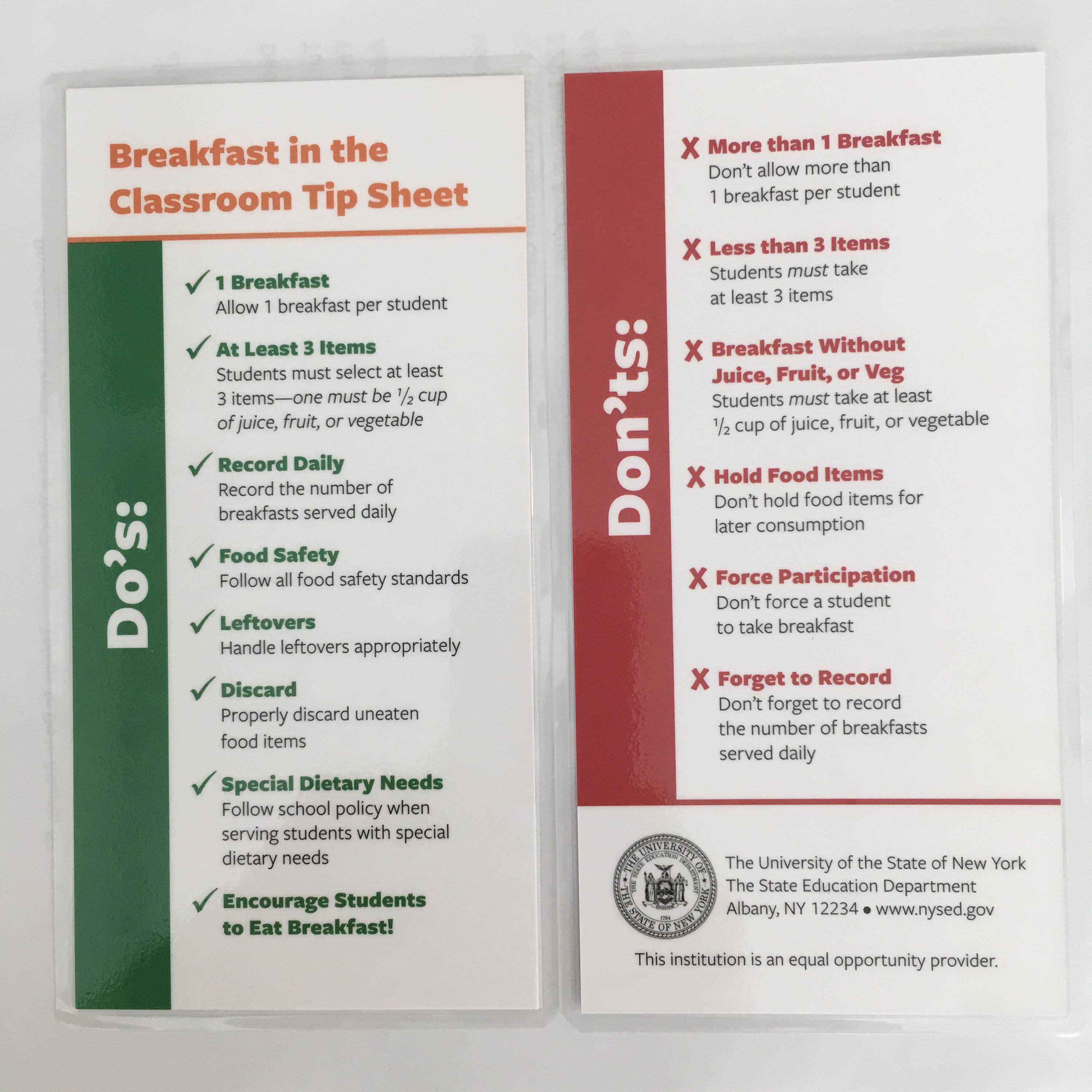 Laminated list of Do's and Don'ts when conducting breakfast in the classroom.